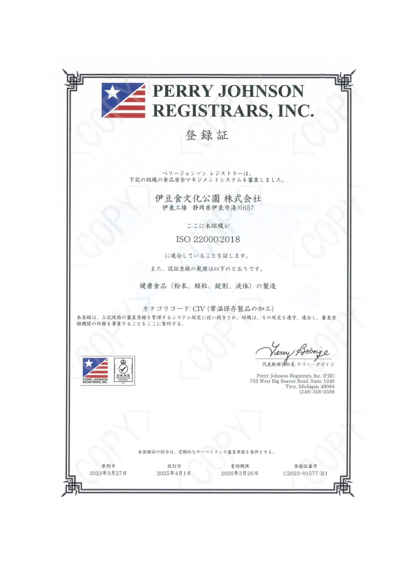 伊東工場においてISO22000:2018をペリージョンソンレジストラー(Perry Johnson)にて認証取得しております。ISO22000は食品安全マネジメントシステム(FSMS)に関する国際規格で、食品の生産から消費に至るまでの全段階で、食品の安全を確保するためのシステムを構築することを目的としています。食品に特化しており最も厳しい基準を持つと言われているISO22000と健康補助食品GMPの取得によりより安心して弊社へお任せいただけるよう、管理体制を整えております。